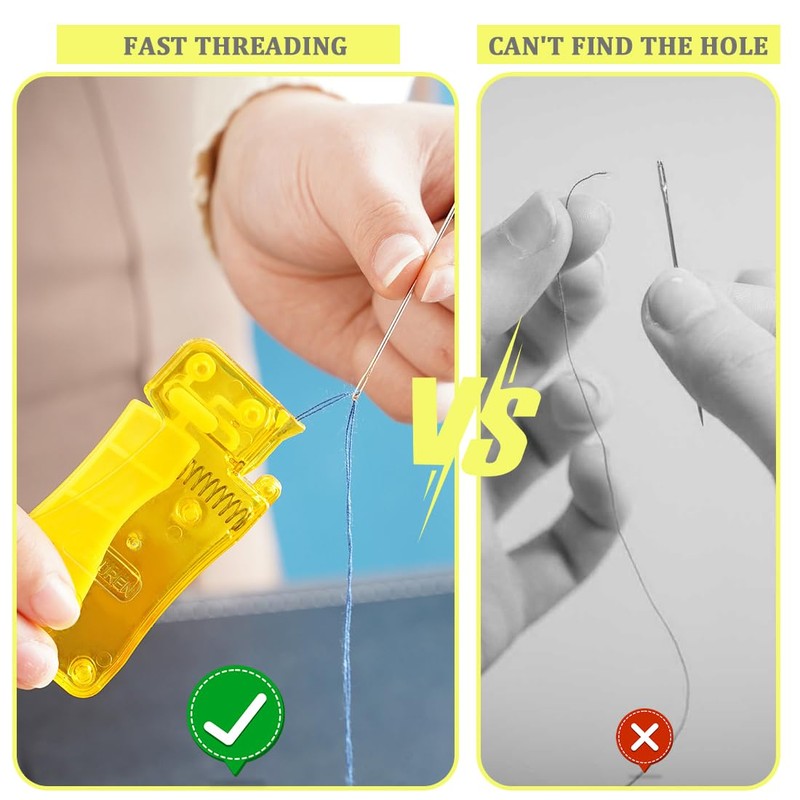 • 2 needle threaders. No need to pay attention to the needle hole. Simply insert the needle, press the button to expose the hook, then hang the sewing thread on the hook, then release the button and pull out the needle to finish the work.