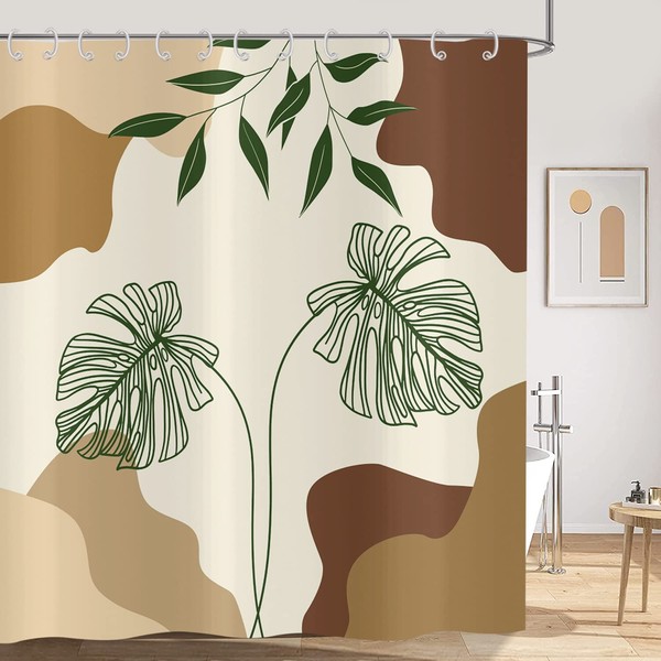 Hnmdmyi Shower Curtain Boho 180 x 180 cm, Abstract Green Tropical Leaves Plant Beige Bath Curtain Mid Century Modern Minimalist Geometric Aesthetic Art Waterproof Fabric Bath Curtain