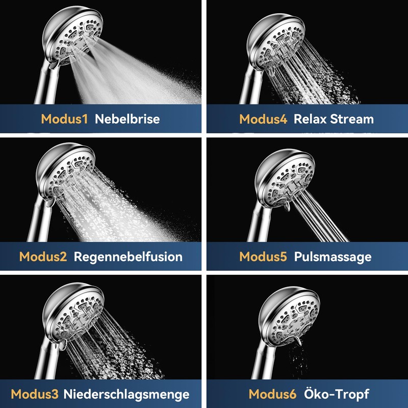 - Sechs erfrischende Spr1hmodi: Erleben Sie Nebelbrise, Regennebelfusion, Regen, Entspannungsstrom, Pulsmassage und Eco-Tropf-Einstellungen C geeignet f1r alle Ihre Duschpr?ferenzen