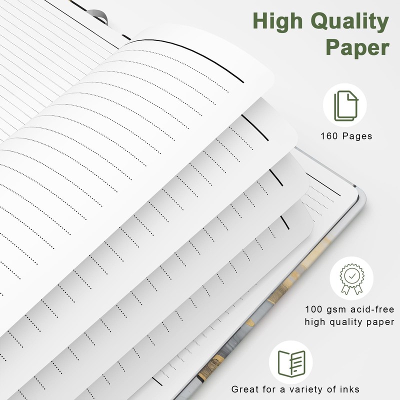 - Hardcover notebook: the journal measures 5.8 x 8.4 inches, includes 160 pages of ivory thick paper, 1 bookmark, 1 inner pocket and 1 elastic closure strap, perfect for daily writing, journaling, taking notes, drawing and more. Lays flat 180° for comfortable writing and reading. With rounded corners for easy carrying.