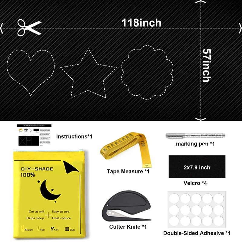 • ⭐【Best Gift】Package Includes: ① 57 ''H * 118''L 100% Portable Blackout Curtain ② 3M Ruler ③ Velcro (3.9Hx7.9L inches) X4 ④ ⑤ Knife ⑥ Marking Pen ⑦ Travel Waterproof Bag ⑧ Instructions.