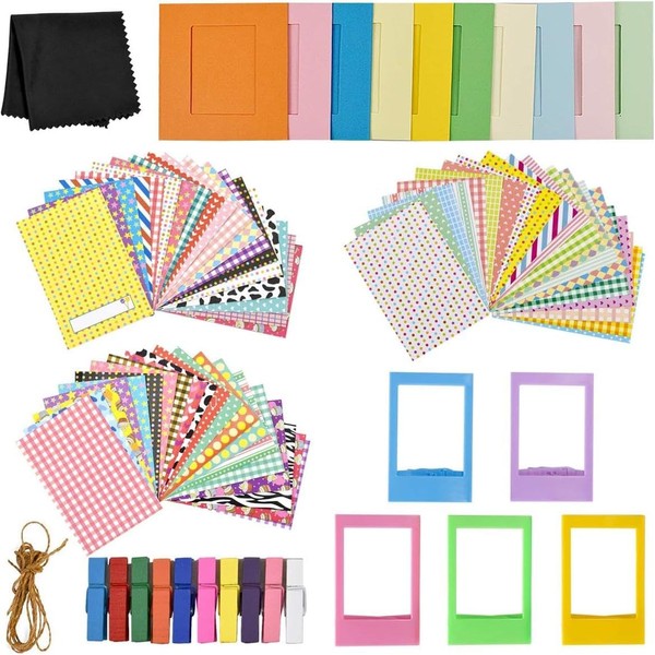 HoaaiGo 86 Pieces Instant Camera Mini Accessories, 60 Photo Frame Stickers, 10 Photos Paper Frame, 10 Colourful Hanging Clips with Cord, 5 Plastic Photo Frames and 1 Microfibre Cloth, for Mini 9 8 8+
