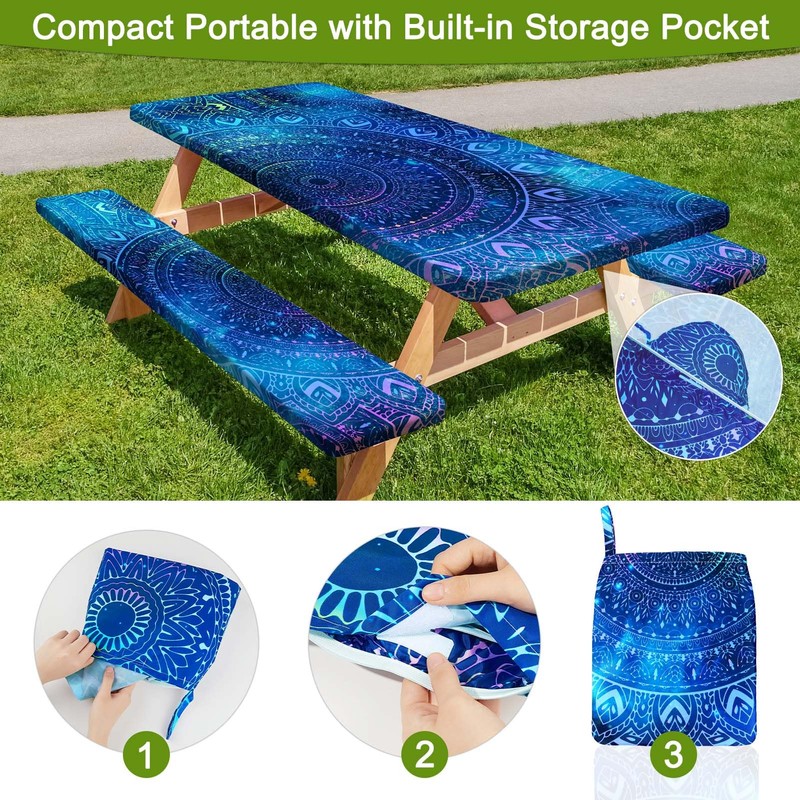 HobbLab Picnic Table Cover with Bench Covers Portable Table Cloth Built-in Storage Pocket Fitted Tablecloth with Elastic Edges Waterproof Camping Essentials for Indoor Outdoor Rv,72in,Blue Purple