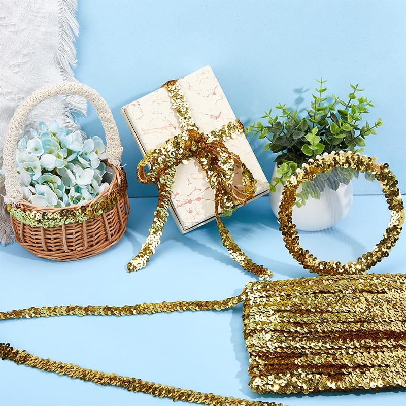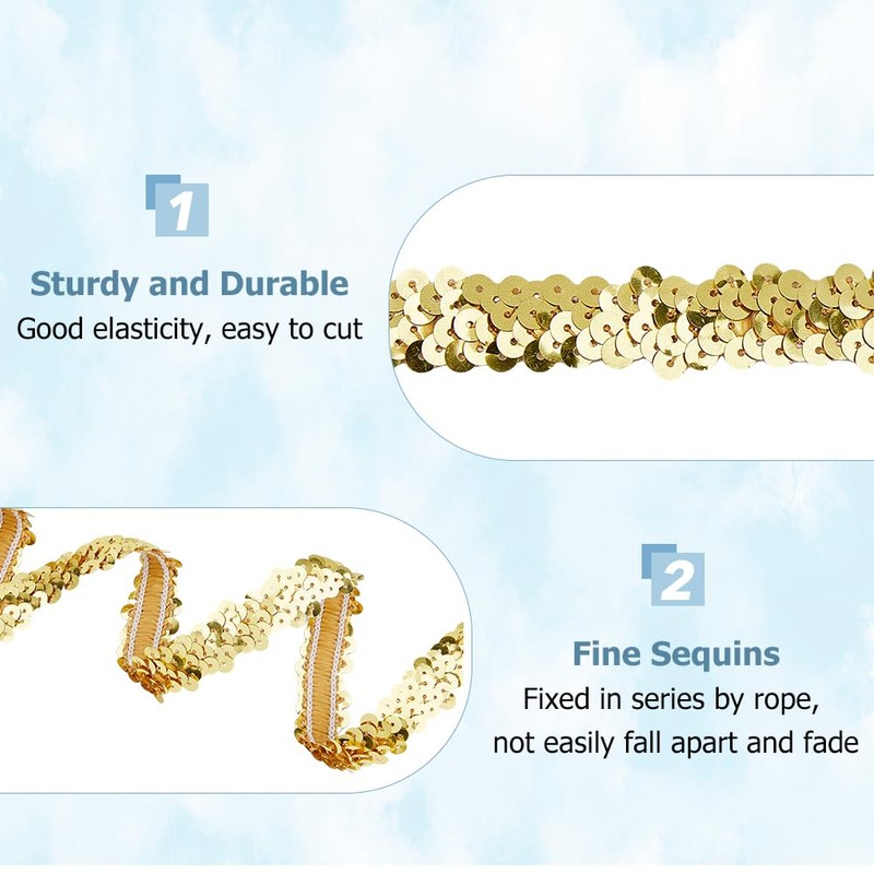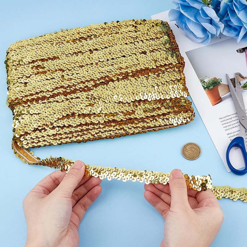 - Gold Sequin Ribbon: Sewing glitter is gold with elastic elastic at the bottom, making sewing flexible and easy to use. Beautiful and bright colors add fashion to your items.