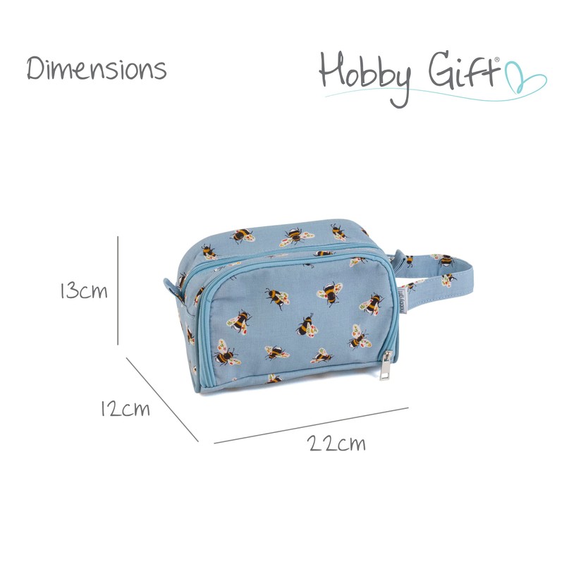 Hobby Gift Crochet Bag - Yarn Storage with Eyelet - Zippered Pocket for Crochet Hooks - 100 Cotton 12 x 22 x 13cm - Blue Bee