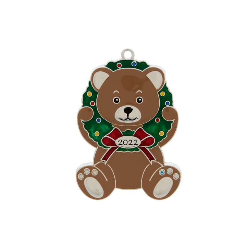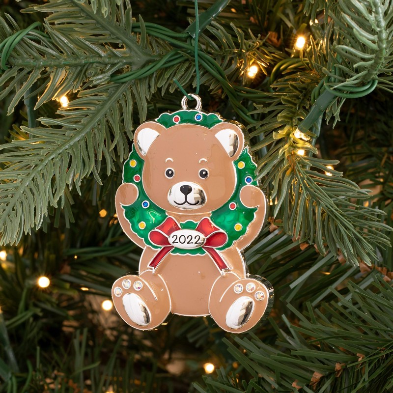 - DESIGN FEATURES: Adorable teddy bear ornament featuring a festive wreath with colorful accents and a red bow marked with '2022'