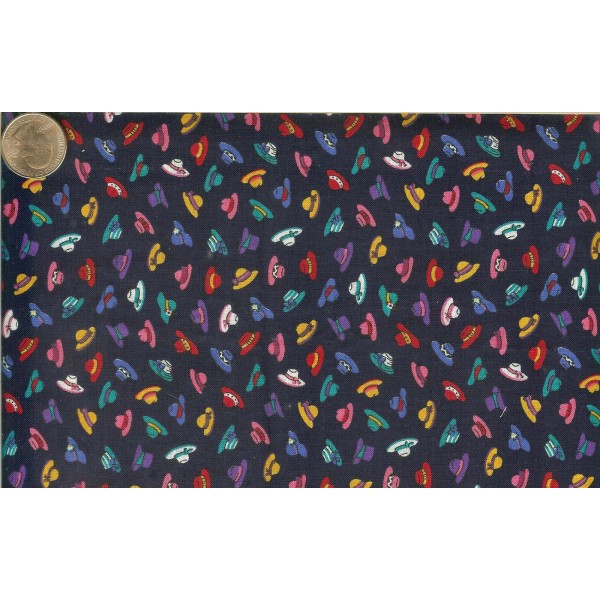 SOLD BY THE HALF YARD IN A CONTINUOUS PIECE AS PURCHASED  - 44" WIDE - NEW/UNWASHED PRETTY "MINI HATS ON NAVY" CRANSTON - COTTON FABRIC.     IT IS OUT OF PRINT AND NO LONGER AVAILABLE.  IT COMES FROM A SMOKE FREE ENVIRONMENT.  WE COMBINE SHIPPING COST.