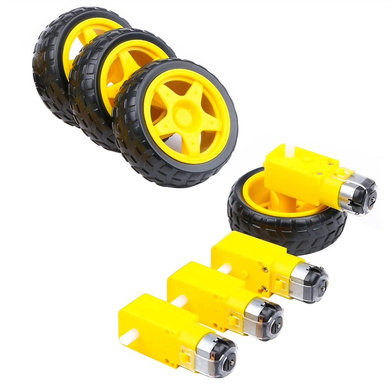 Dc motor Kit includes 4pcs yellow electric motor, 4-piece plastic tires with tread pattern.