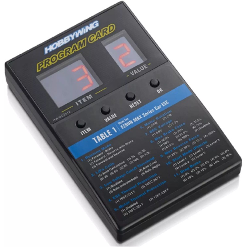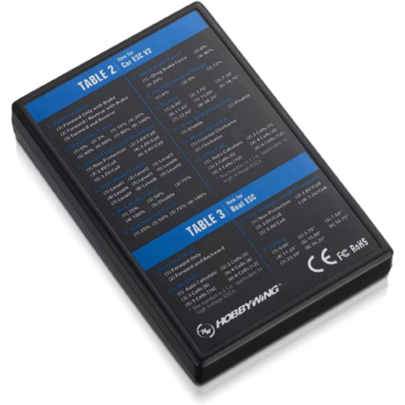- The Hobbywing LED Program Card is used to program Hobbywing ESC's. It features a user friendly interface and is easy to use. Package includes program box and 3-wire male/male plug for hooking the programmer to the ESC.