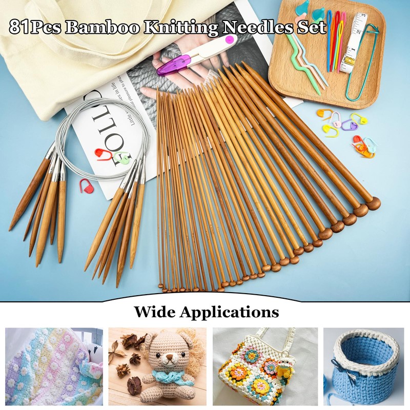 - 【Packaged Included】 You will have 36Pcs 9.8"/25cm straight knitting needles set and 8Pcs 32"/80cm bamboo circular knitting needles set.And 3 cable needles,1 stitch holders,4 knitting needle stoppers,6 plastic large eye needles,1 scissors,1 tape measure,20 stitch markers and 1 canvas bag.Complete knitting kit meet your daily needs