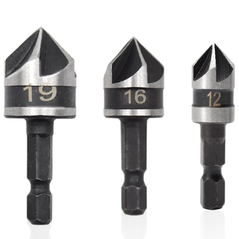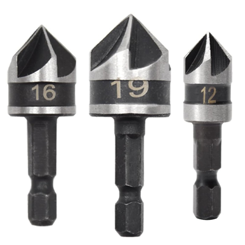 Hocansen 3-Piece Drill Bit with Countersink Hexagonal 5 Flutes Countersink Drill 90 Degree Punch Tool Chamfer Drill Bit for Countersink Wood Plastic (LJ-ZT/12/16/19 mm)