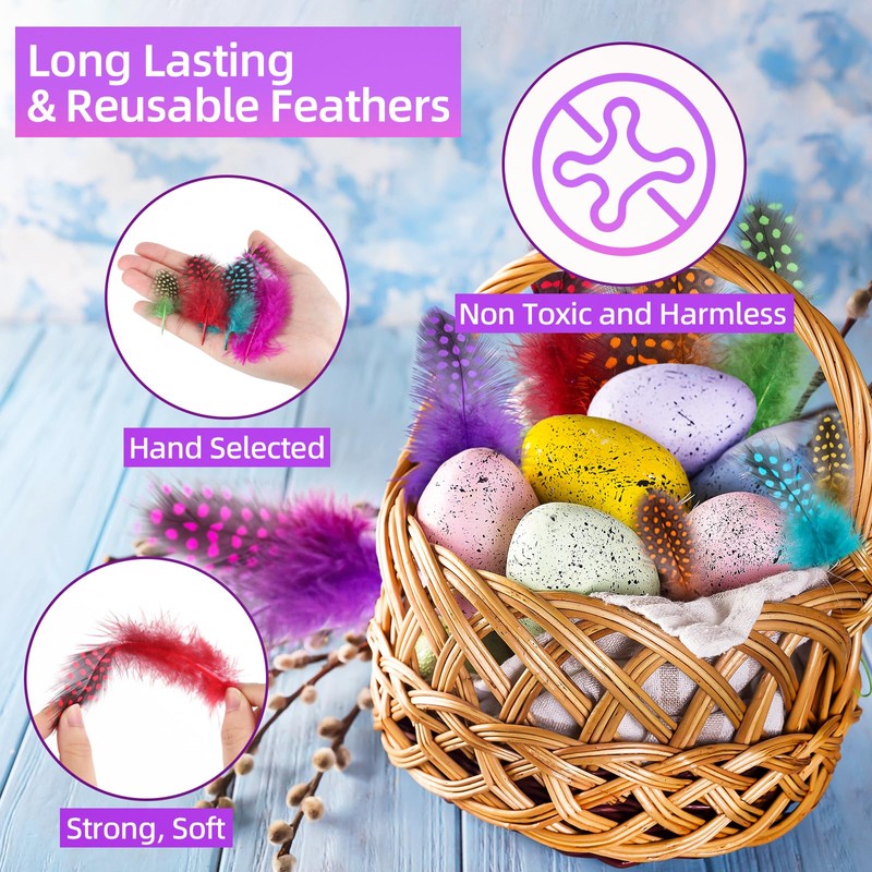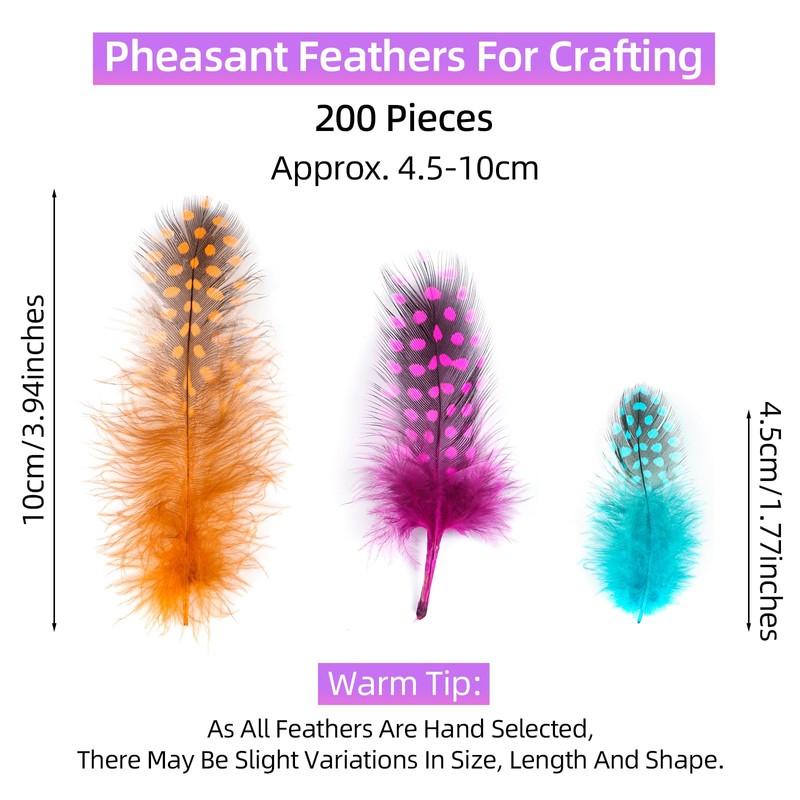- Exquisite appearance: with their natural stains and original, fine patterns, the feathers of the wild pearl chickens are small and light and bright, making them perfect craft decorations. You will receive 200 colourful craft feathers with a length of 4.5 cm to 10 cm and the length of each feather varies, which are suitable for different craft sizes