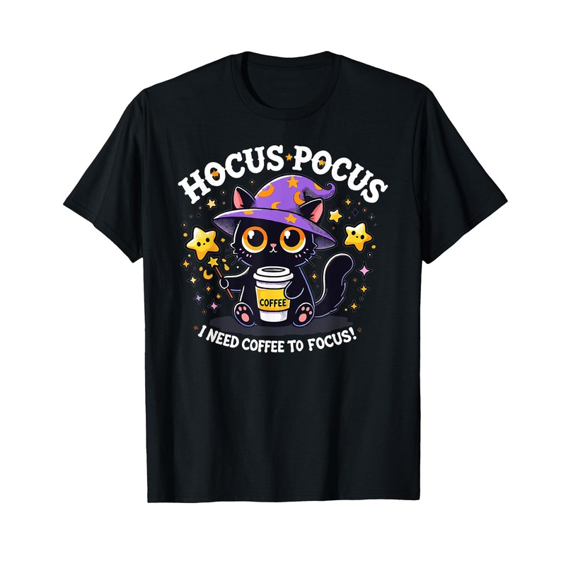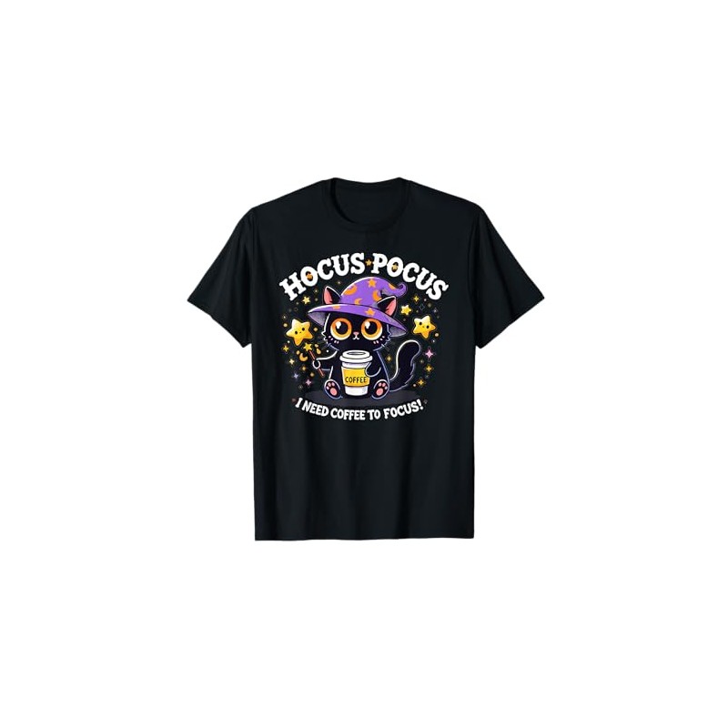 - Halloween with our captivating Hocus Pocus I Need Coffee to Focus Funny Kitten design, featuring a cute cartoon illustration of a black cat with big orange eyes, wearing a purple wizard hat, and holding a star-tipped wand & a coffee cup.