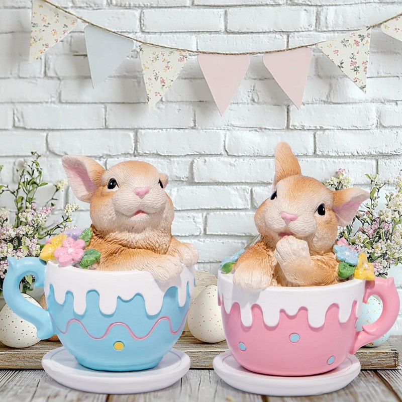 Hodao Easter Bunny Cupcake Figurines – Set of 2 Resin Bunny Easter Decorations with Carrots and Eggs – Cute Spring Tabletop Decor for Easter Celebration, Home, Office, Gifts (Set of 2 Cup Brown)