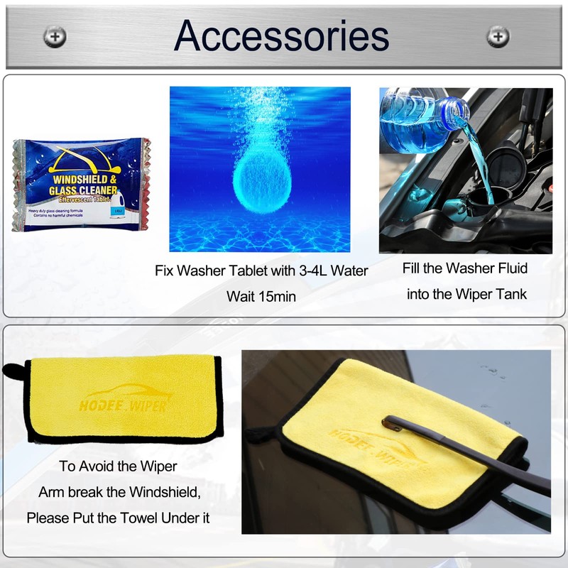 - Packing Includes: Rear Wiper Blade + Windshield Wiper Blade + Clean Cloth + Washer Tablets
