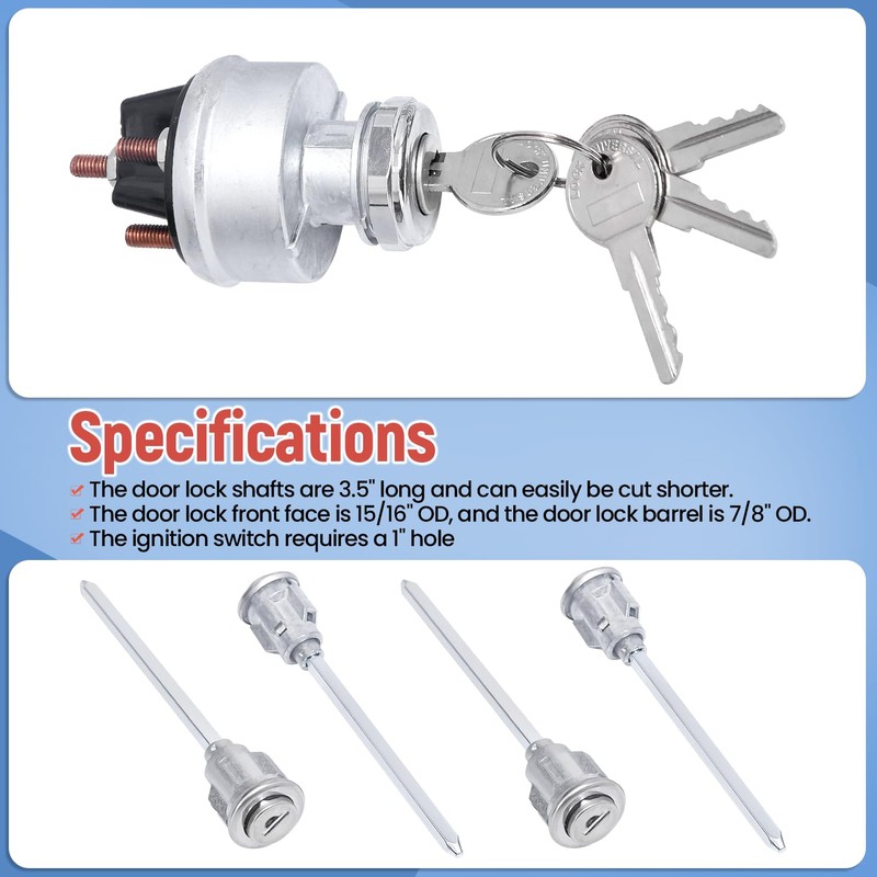 • [Specifications]: The door lock shafts are 3.5" long and can easily be cut shorter. The door lock front face is 15/16" OD, and the door lock barrel is 7/8" OD. The ignition switch requires a 1" hole