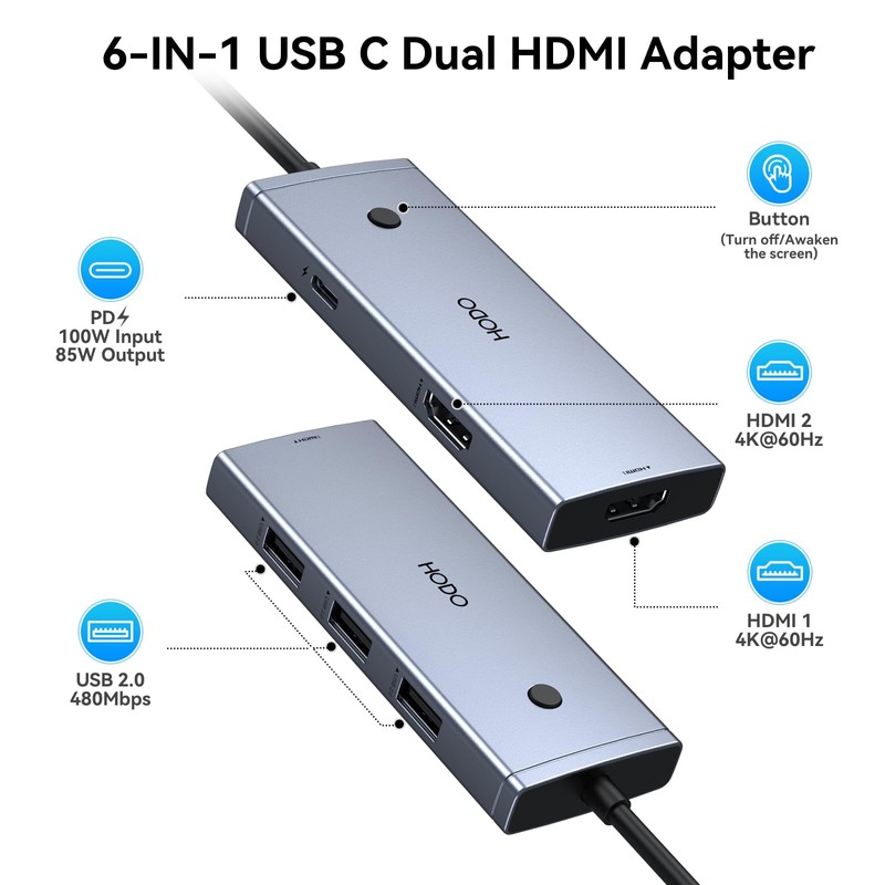 HODO Docking Station to Dual HDMI Monitors Adapter USB C to Dual HDMI Adapter 4K 60 Hz for Laptops Docking Station Dual Monitor with PD 3 USB Port Button Compatible for HP Elitebook Dell XPS 13 15 etc