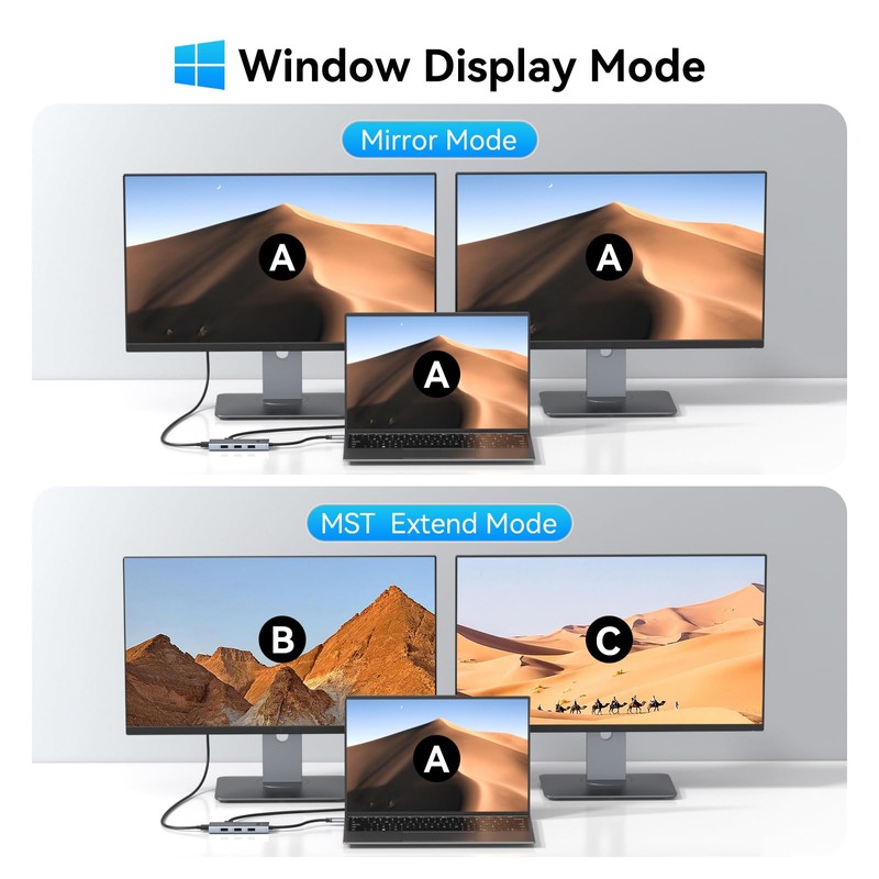 - Dual 4 K HDMI Monitor Docking Station : USB C Hub with 2 HDMI port use HDMI port to enter mirror mode for usb c laptops or extended mode and transfer 4 K 60 Hz HD video with 3D effect from laptop screen to a monitor, projector, HDTV, etc. Support both SST and MST mode. Support dual display for your windows laptops. 2 HDMI ports can be used simultaneously, resolution up to 4 K 60 Hz. Please note that if you use it to connect macbooks, it only support mirror mode without extended mode