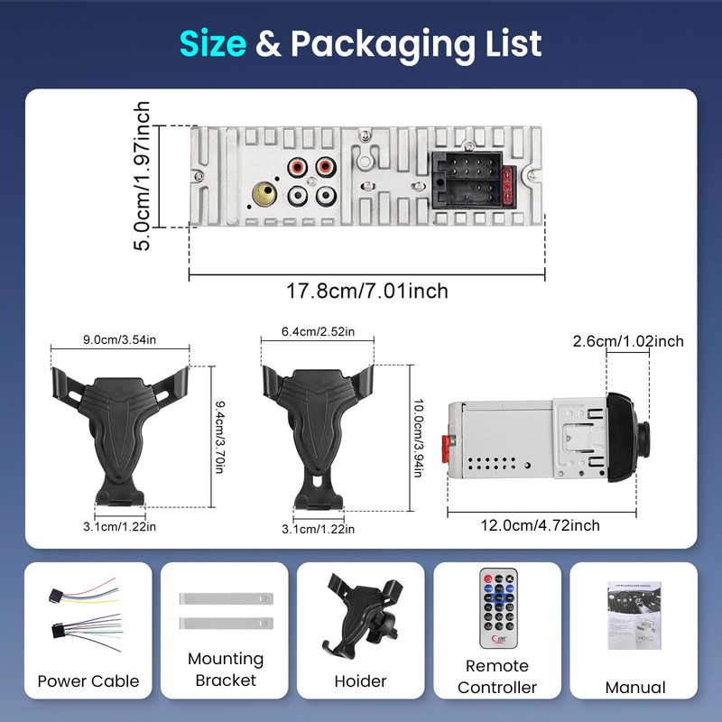 - 【Universal 1 Din Car radio 】Single din bluetooth car stereo with LCD display, Standard 1 din size for universal cars: 178mm (W) * 50mm (H) * 120mm (D). Very shallow depth for greater installation flexibility