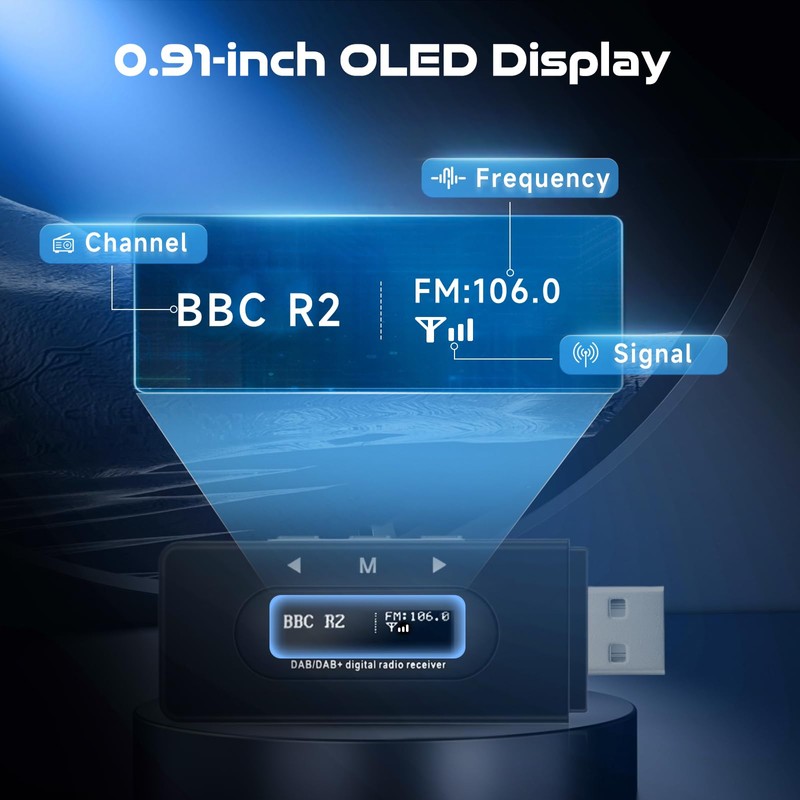 - Plug & Play with USB Power and OLED Display: This adapter is powered by USB A interface, easy to install and use. The 0.91-inch OLED display delivers clear channel and frequency information, while the included 3-meter film antenna ensures optimal signal reception. Simply connect, install the DAB app and enjoy digital radio in minutes.