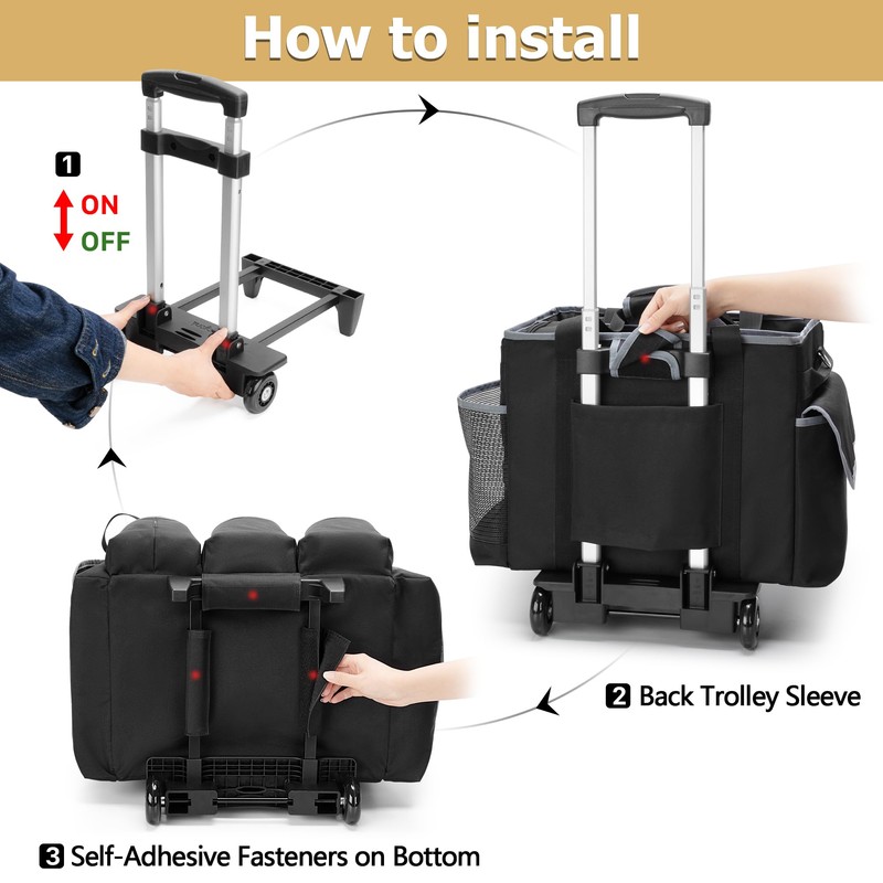 - Trolley Installation: Take out and open the telescoping trolley; Nest the back trolley sleeve of the bag into the trolley from the top; Use self-adhesive fasteners to fix the bottom and back positions; telescoping trolley can be extended up to 36.8 inches