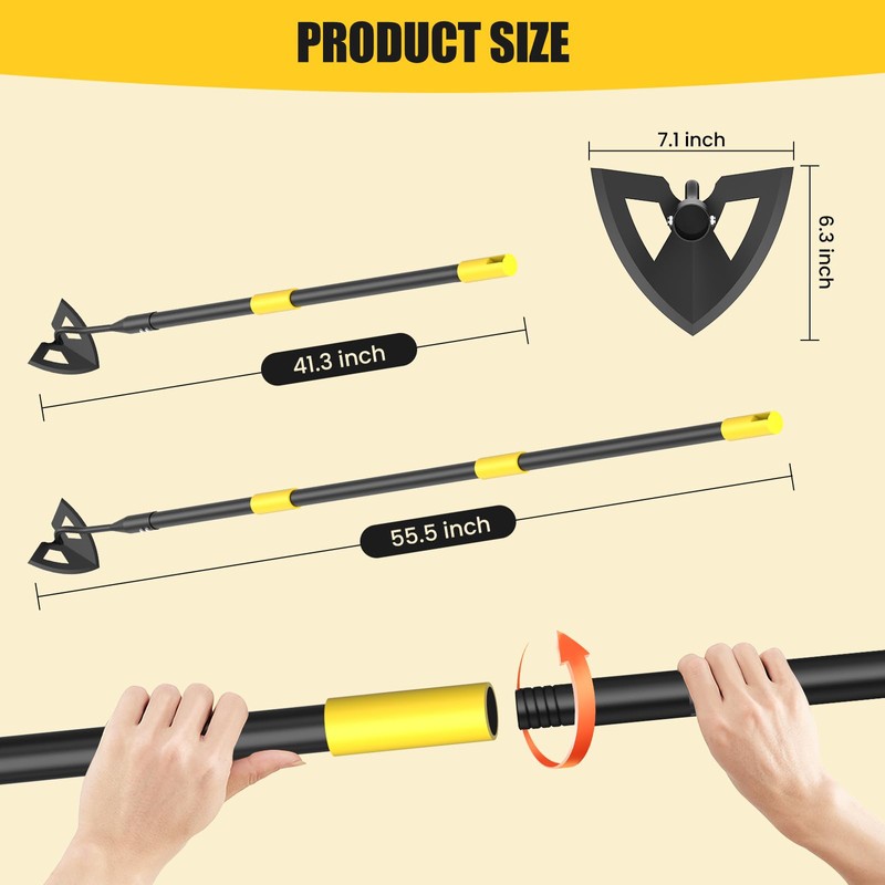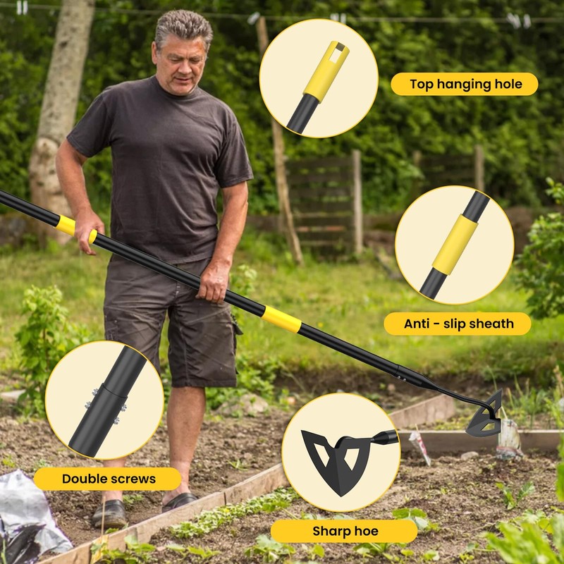 - Adjustable Length - Taking into account the user's height, habits and different gardening needs, the garden hoe has an adjustable handle from 41.3 to 55.5 inch. Shorten the handle of the gardening tools for flexible weeding in narrow flower beds; lengthen the handle to bend less and cover more area in large vegetable plots