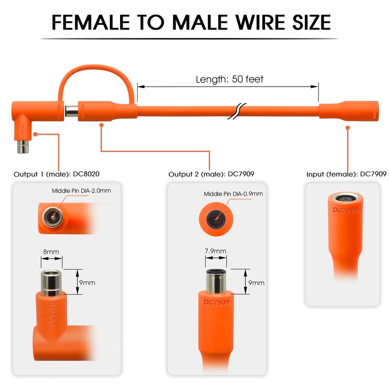 - Professional Solar Extension Cable: Package includes: 1x 50FT extension cord. Wire gauge: 14AWG, temperature range: 5℉~176℉ (-15°C~80°C), rated voltage: 18V DC, rated current: 15A, connector type: input (female): DC7909, output (male): DC7909/DC8020