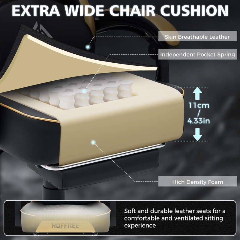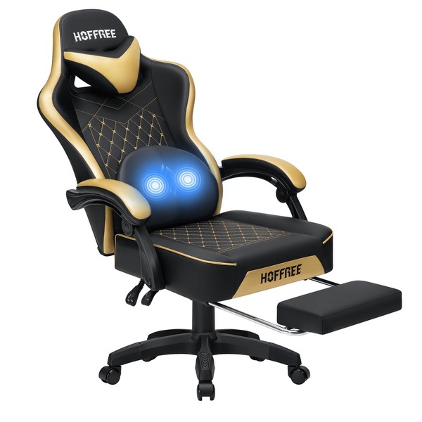 HOFFREE Gaming Chair with Massage Lumbar Support Leather High Back Ergonomic Computer Gaming Chair Adjustable Swivel Game Chair with Footrest Black and Gold