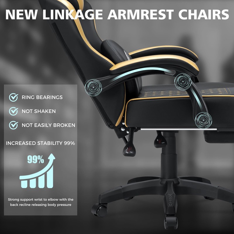 - 【RECLINING GAME CHAIR】90°-135°adjustable reclining gaming chair with footrest suitable for various scenarios such as working, gaming, reading or napping and linkage armrest chair is more comfortable when relaxing. Gamer chair also with 360°rotating multi-directional racing-car rollers.