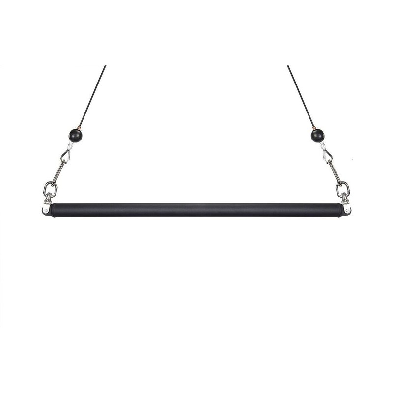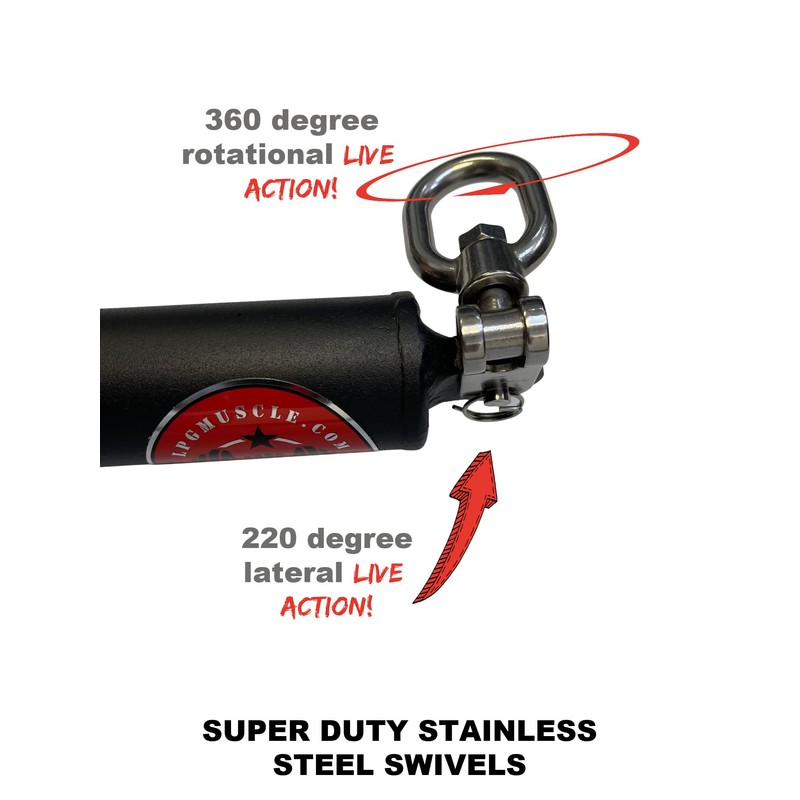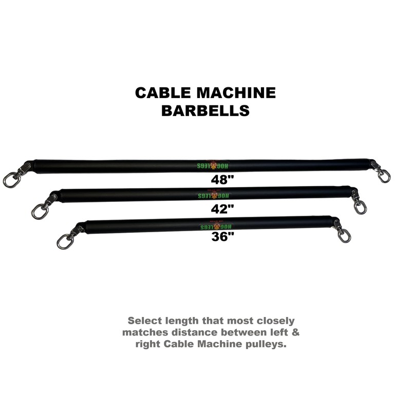 Finally a Cable Machine Barbell! This is a total body exercise bar ( Standard 1-1/4" round ) for Multi Gym machines, Functional Trainers and Cable Crossovers. Train all body parts with this latest addition to the HOG LEGS family line up! Features Dual 'Live Action' Swivel Attachment Rings for unrestricted exercise freedom. Use for Bar Squats, Rows, Chest and Shoulder Presses, Bicep Curls, Triceps Extension exercises and much much more! HOG LEGS Dual Cable Bar 48" is USA Made with Lifetime Replacement Warranty.