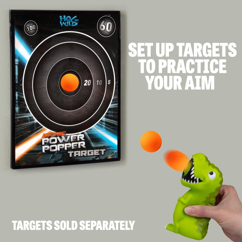 - Ready, aim, POP! Squeeze the T-Rex Dinosaur Popper to pop a soft foam ball up to 20 feet!