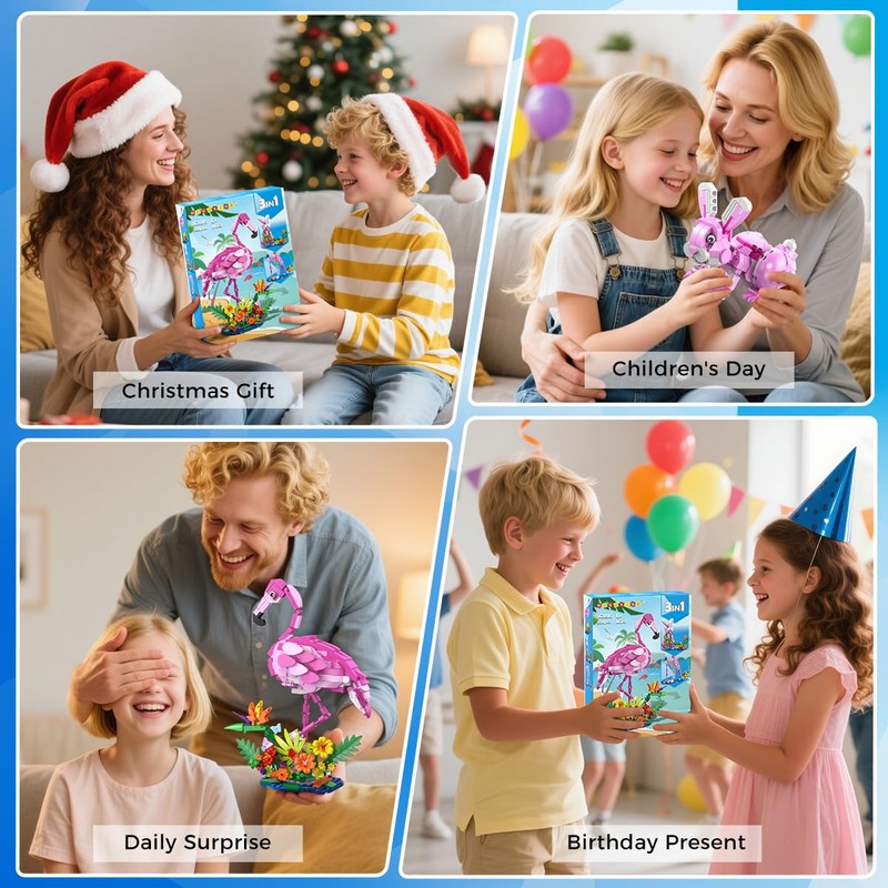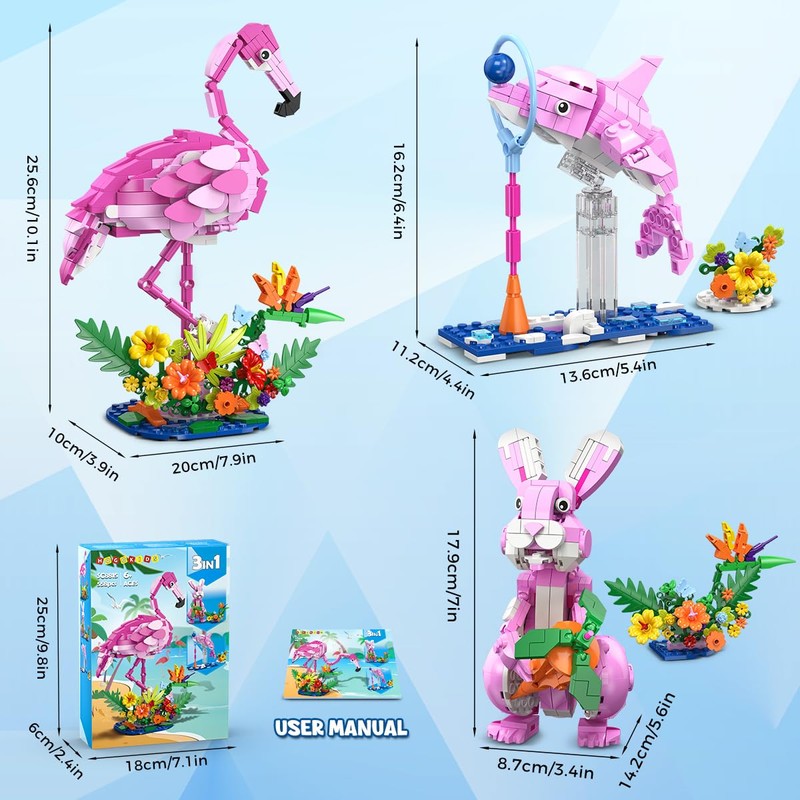 3 IN 1 PINK ANIMAL TOY FOR KIDS - HOGOKIDS 3 in 1 pink cute animal figures building set lets kids build and rebuild 3 different animal figures with the same bricks: pink flamingo, rabbit and dophine. Kids are free to choose their favorite critters to build and role-play stories with these lively charaters (Note that models cannot be built simultaneously)