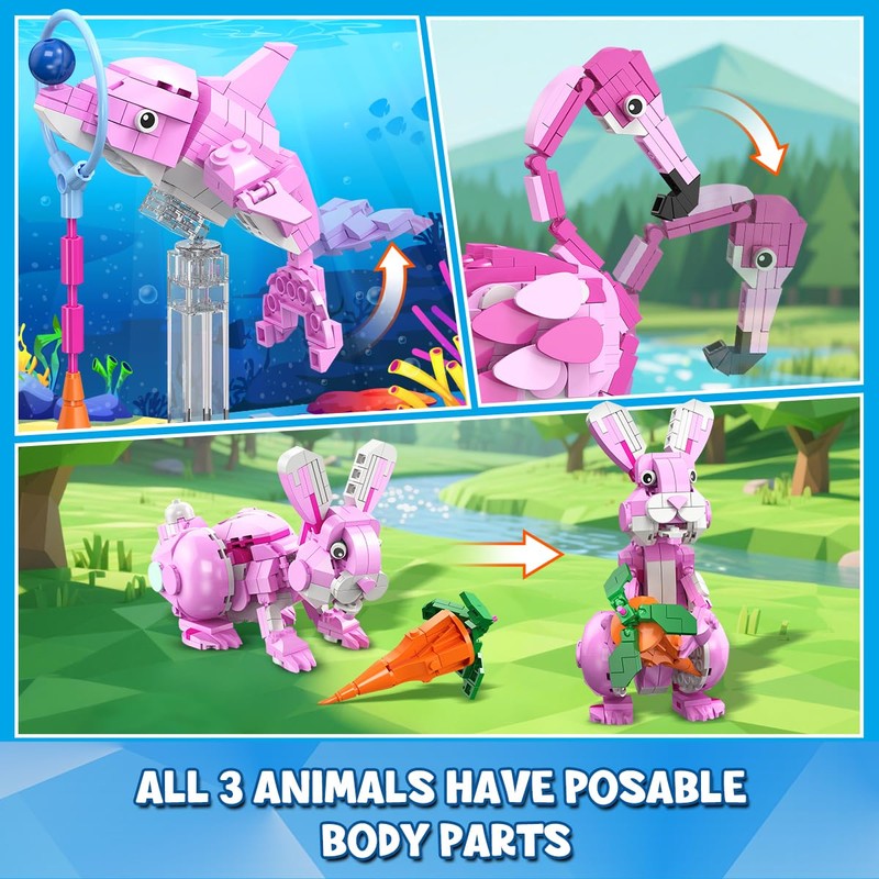 - POSABLE ANIMAL FIGURES - All 3 animals are designed with posable, flexible joints. The pink rabbit can move its its head, ears, forelegs and hind legs, transforming from upright to lying down. The pink flamingo can move its head and neck and the dolphin can raise its tail. This thoughtful design adds more interactivity to the toy, so kids can fully enjoy imaginative play with the cute flamingo building block