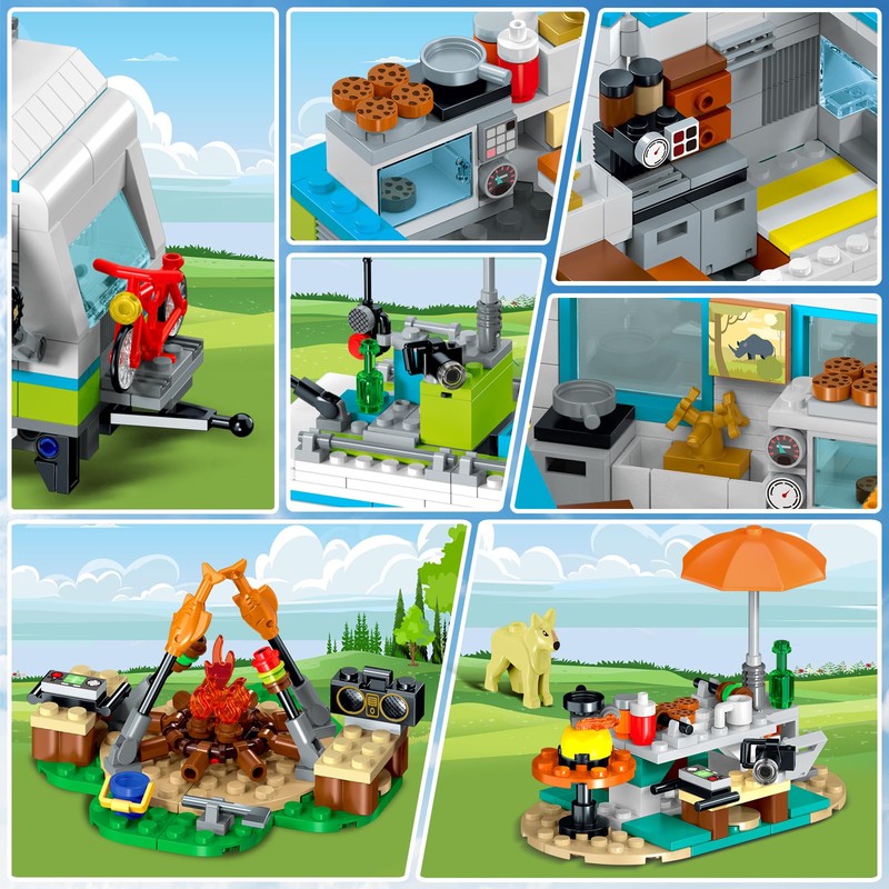 - Highly restored details - This camper van building set is fully equipped for your outdoor getaway, a dining table and a barbecue grill. Inside, you can see an oven, a stove and a comfortable bed. There is also an audio, an intercom, a camera and a bicycle, which add fun to this camping adventure. Gather around the campfire with family for delicious barbecues, listen to music, and go on an adventure on a bicycle, making your camping trip unforgettable and full of joy(Figures No Included)
