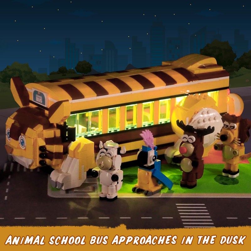 - BUILD A VIBRANT ANIMAL ADVENTURE - Spark imagination with this charming animal school bus building set! Kids will adore constructing the cat-shaped school bus, complete with a detachable roof, legs and tail, glowing led lights, and six adorable animal figures: lion, parrots, deer, cow, tiger. The modular design allows quick transformation from a cat bus to a rolling adventure vehicle, perfect for dynamic storytelling.