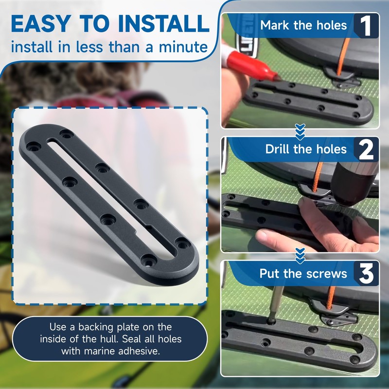 • Easy Installation: each kayak track comes with 8 stainless steel self threading screws; Choose the mounting surface and check for ease of access to the underside, then bolt the base to the kayak, for added strength, using a backing plate on the inside of the hull and sealing all holes with marine adhesive