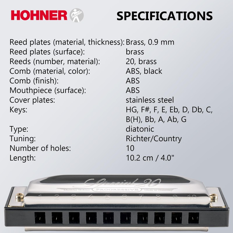 Adding value to your purchase, Austin Bazaar bundles your instrument with necessary accessories! Everything you need to start playing immediately comes in one box. Save yourself the hassle and save some money while you're at it. An instructional book is included so you can practice with guidance. An Austin Bazaar polishing cloth is included so you can keep your new instrument in mint condition.THE WORLD’S MOST COPIED HARMONICA DESIGNA unique, beautifully mellow sound, based on a revolutionary concept: the Special 20 was the first diatonic harmonica in the world with reed plates recessed into the comb, creating a projecting plastic mouthpiece. This makes it more comfortable to play, and the most copied harmonica design worldwide. Its distinctive sound is perfect for everything from Folk and Country to Rock and Pop. The Special 20 offers everything a professional harpist needs, but it’s also the ideal beginner’s instrument thanks to its smooth playability and comparatively affordable price. If you’re not just looking for a companion for the first few steps, but one to take you all the way, the Special 20 is your best possible bet.FEATURES:Recessed reed plates -The reed plates are recessed for a more comfortable mouthpieceDurable plastic comb - Reliable performance under all climate conditions thanks to resilient plastic combSpecial cover plates - The cover plates have a small back opening to highlight the warm sound.TECHNICAL DETAILS Reed plates (material, thickness): brass, 0.9 mm Reed plates (surface): brass Reeds (number, material): 20, brass Comb (material, color): ABS, black Comb (finish): ABS Mouthpiece (surface): ABS Cover plates: stainless steel Keys: HG, F#, F, E, Eb, D, Db, C, B(H), Bb, A, Ab, G Type: diatonic Tuning: Richter/Country (Country just in F#, F, E, Eb, D, Db, C, B(H), Bb, A, Ab, G) Number of holes: 10 Length: 10.2 cm