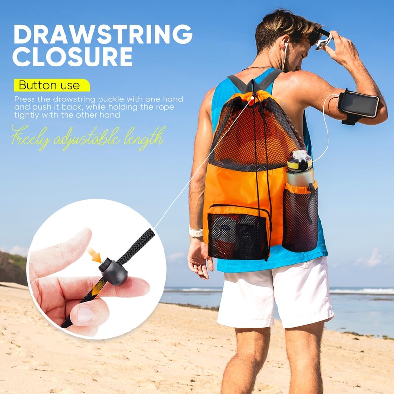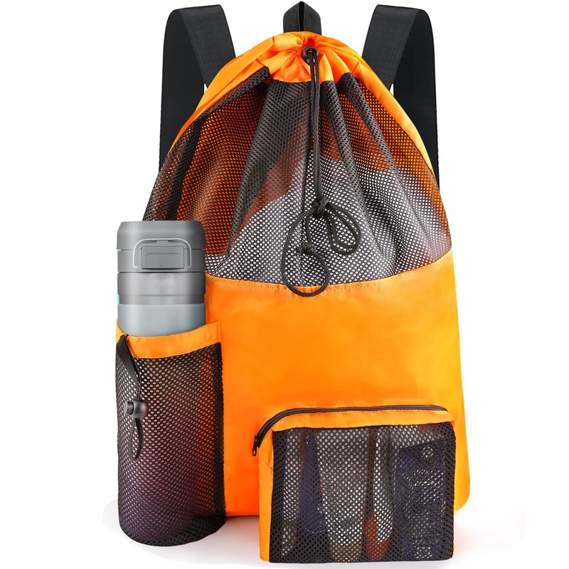 - ✅ LARGE CAPACITY STORAGE: This mesh beach backpack has a large 40L main compartment, providing ample storage space, perfect for holding swim training gear, snorkeling gear, beach items, beach towels, and more. Well-designed divider and pocket organization system makes it easy to sort personal items and find items.