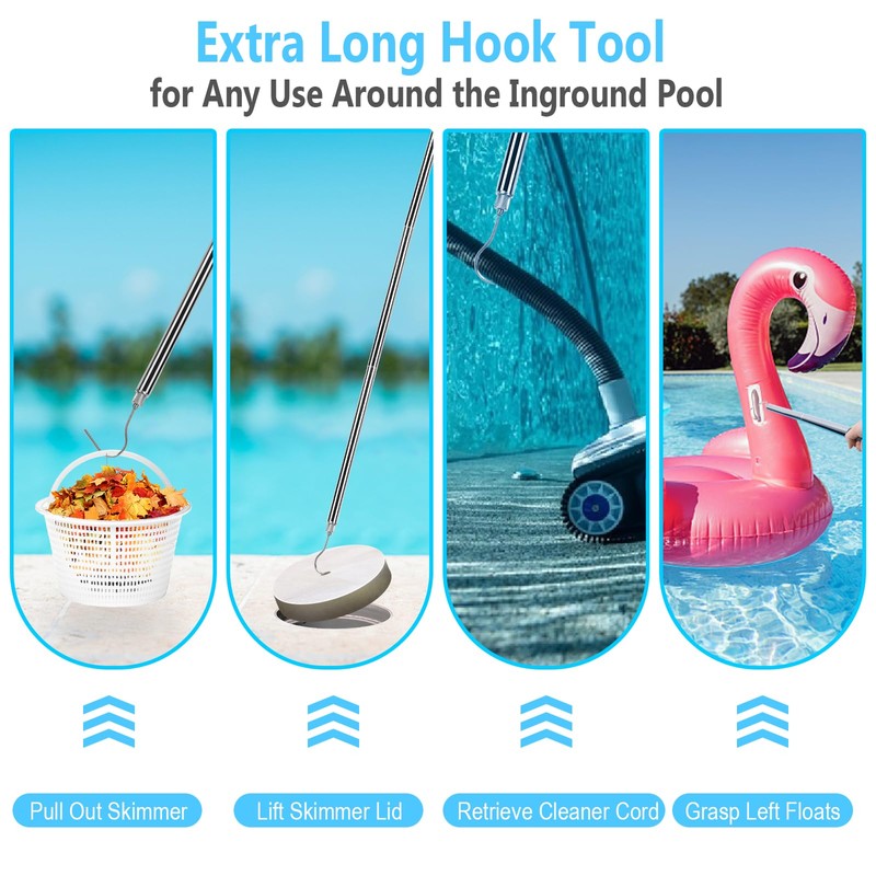 - [Handy Pool Tool Around the Inground Pools] This pool hook with long handle helps you lift skimmer cover and skimmer basket without having to bend down to reach it. Strong enough if skimmer basket is full of leaves or heavy material. This device also retrieves pool toys and swimming pool floats out of the pool if you do not feel like going back in to retrieve. Also works to retrieval your vacuum hose and pool cleaner cord.