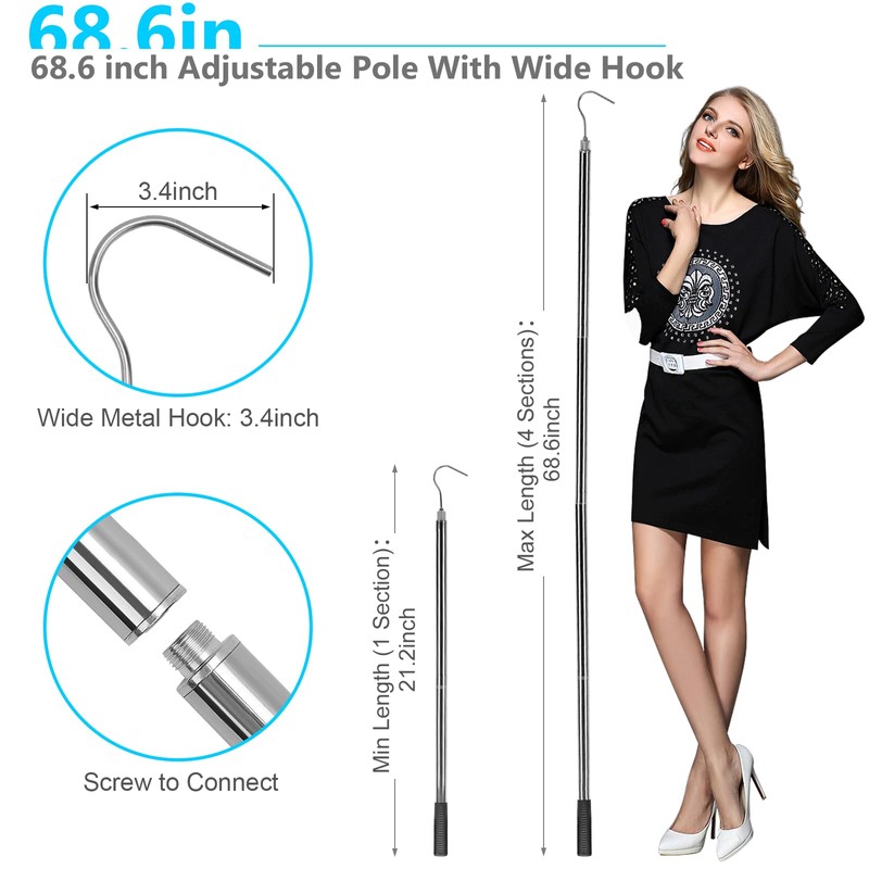 - [Extra Long Hook Tool for Any Use around Pools] This adjustable pool handle contains 4 sections poles. Minimum length 21.2in with one section pole and hook. Maximum length 68.6 inch with all 4 sections and hook installed. Sturdy and strong pole with 1.18in diameter and 35oz weight which makes it an excellent inground pool accessories. Long enough and heavy duty construction pool hooks for the weight of pool robot when lifting it out of the pool and retrieving things in the bottom of the pool.