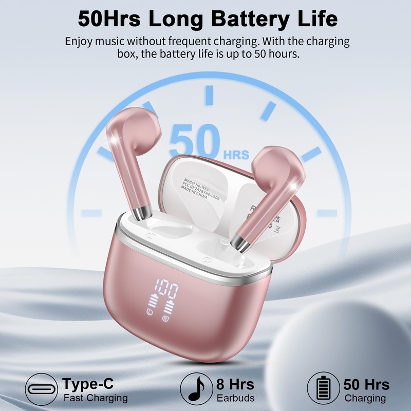 HOIFA Bluetooth Headphones, Wireless Bluetooth 5.4 In-Ear Headphones with 4 ENC Noise Cancelling Mic, 40H Playtime with LED, IP7 Waterproof In-Ear Earphones for Work/Study/Leisure, Rose