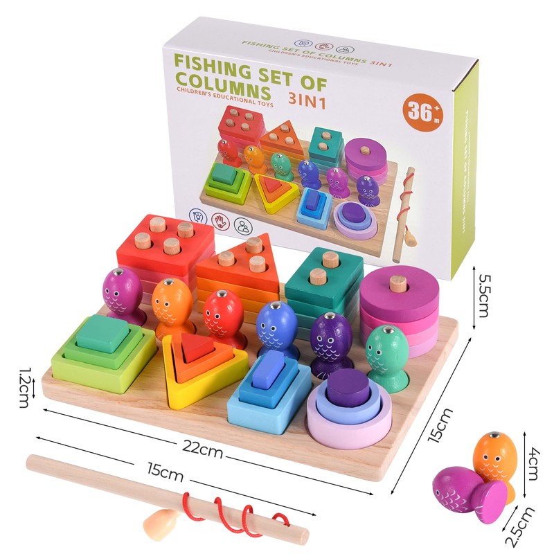 - 3-in-1 stackable fishing toy: the Montessori toy consists of 28 wooden blocks, 6 small fish and a fishing rod, two different stacking games and an interesting fishing game to promote children's hand-eye coordination, logical thinking and creativity