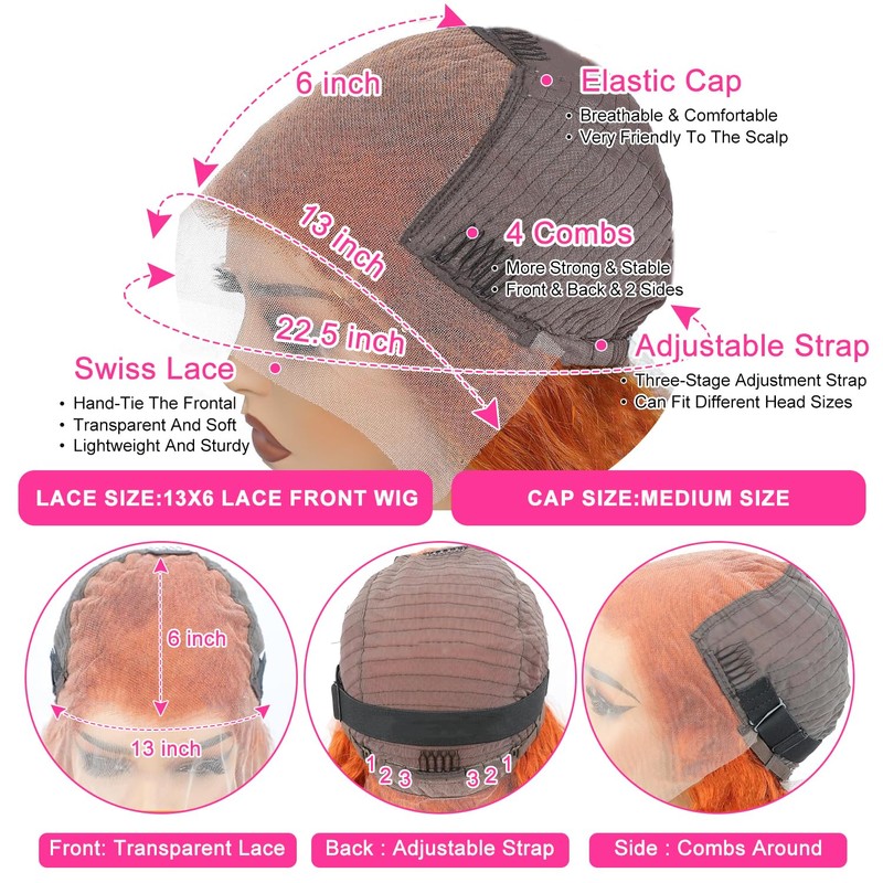 - Ginger Deep Wave Wig Human Hair 13x6 Cap Size: Ginger 13x6 Hd Lace Front Wigs Human Hair, Average Size Cap (22 Inch - 22.5 Inch), Comes With Elastic Band And 4 Combs, Fit Most People, Beginner Friendly, Orange Ginger Wig Easy To Install And Take Off