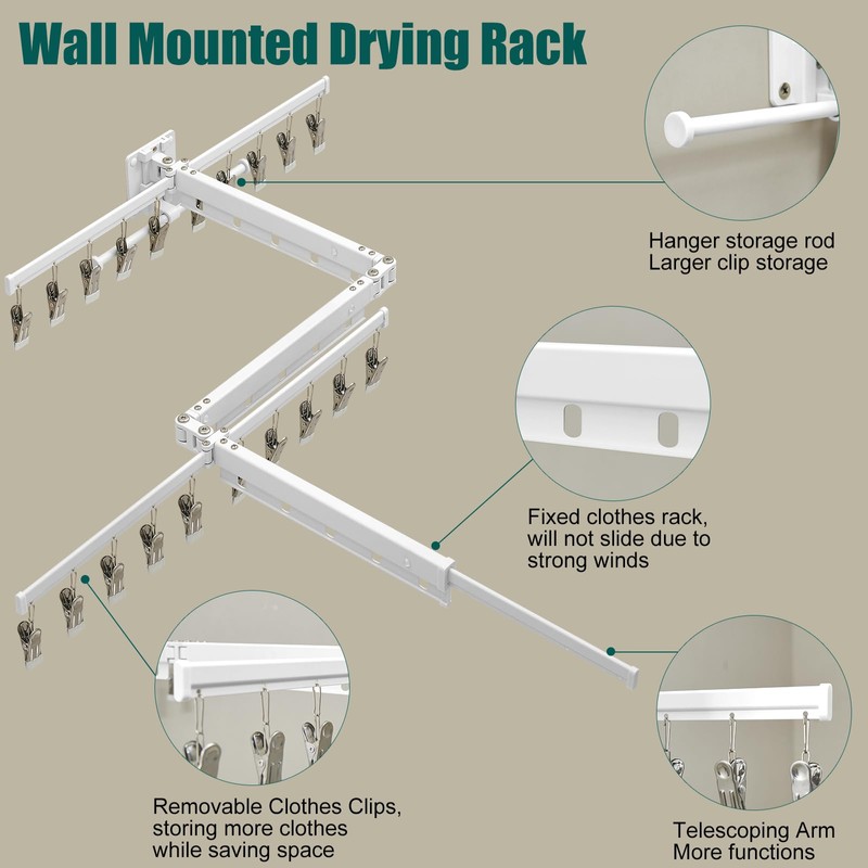 • 360° Rotating Tri-Fold: Tri-fold design for excellent space utilization. When not in use, you can retract the wall-mounted drying rack against the wall to save space. An ideal solution for any living room or laundry room to save space.