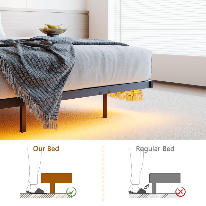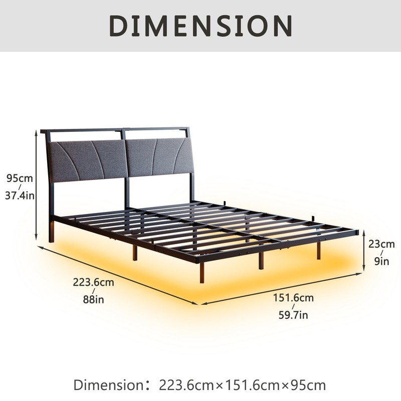 - Floating LED & Charging:Modern metal bed frame queen size with hidden LED strips creates a floating illusion. Built-in 1 USB + 1 Type-C port bedside charging. Metal frame supports all mattress types - queen size bed frame with storage included.