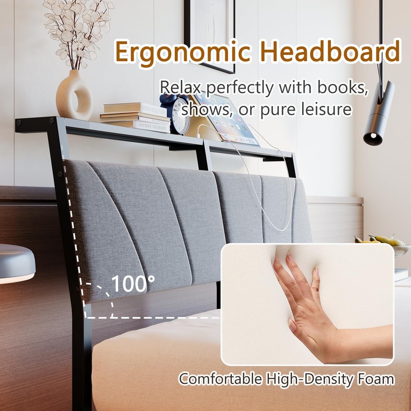 - Ergonomic Headboard & CloudSoft Backrest:This upholstered bed frame queen size features a 100°-Ergonomic headboard with thickened cushioning, contouring to body curves for cloud-like lumbar support relieves back strain.