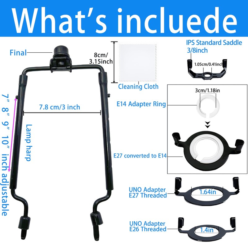 - Package: Your purchase includes a full package of 7 pieces: an adjustable lamp shade holder bracket, a conversion ring (E27 to E14 plastic converter), E26 UNO Fitter adapter, E27 UNO Fitter adapter, a 3/8" IPS standard saddle, and a solid finial on top, plus a cleaning cloth.