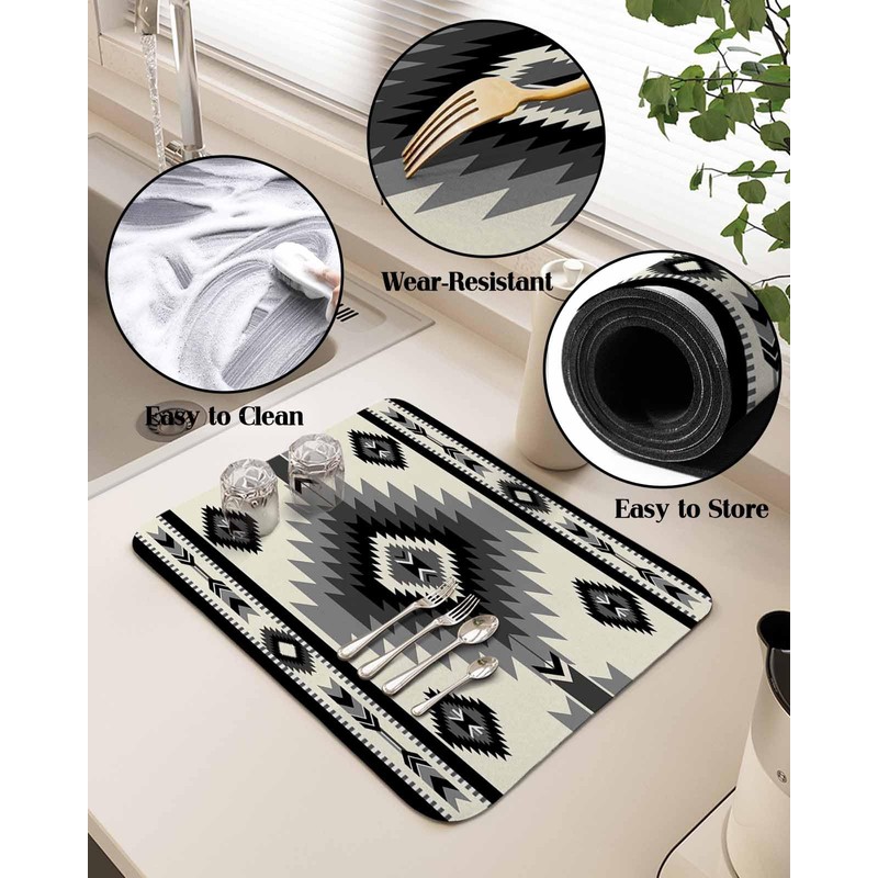 Hokiten Beige Black Southwest Dish Drying Mat for Kitchen Counter, Ultra Absorbent Coffee Mat/Dish Drainer, Western Geometric Abstract Ethnic Quick Drying & Non-slip Drying Mat Rack Pad, 12"W x 16"L