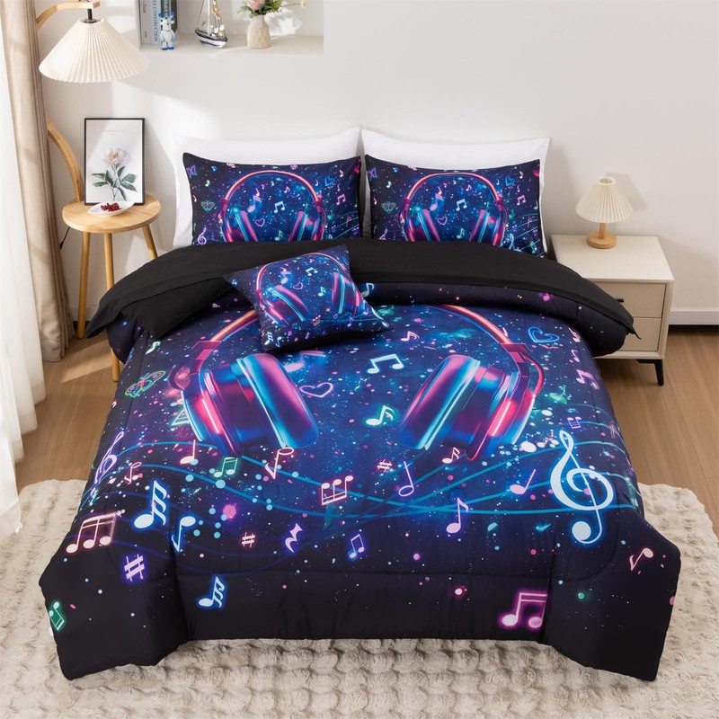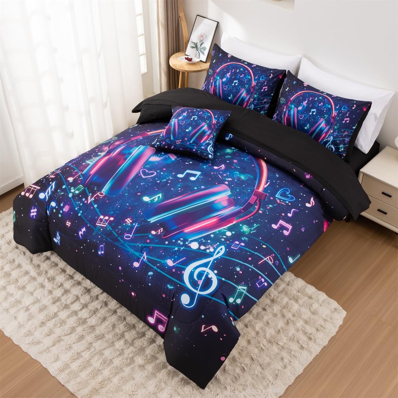 Turn Sleep into a Sensory Rave Experience! Launch your bedroom into a neon dimension with our Galaxy Earphone 6-Piece Comforter Set. Where cosmic wonder meets electric energy: RGB headphones pulse amid fluorescent notes dancing on staves, while glowing hearts and butterflies drift across a star-flecked universe. Every element is crafted to ignite imagination – and literally glow after lights out!