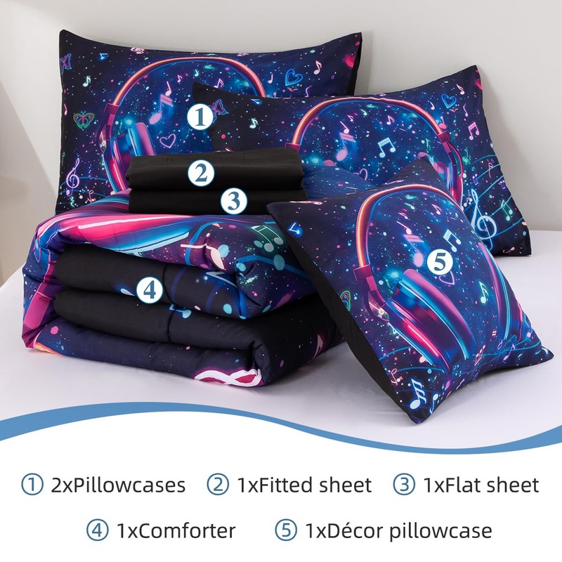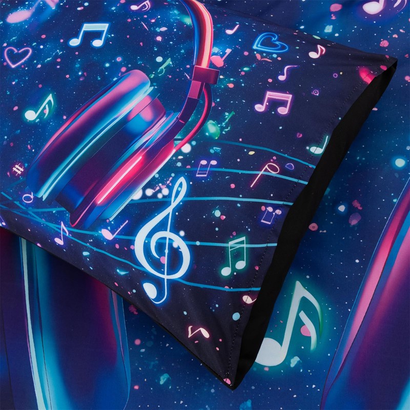 - MAGIC MUSIC BED SET: Experience charged phosphorescent elements (music notes/hearts/butterflies) print + vivid RGB headphones blazing against a cosmic stars backdrop – transforms bedrooms into immersive rave universes